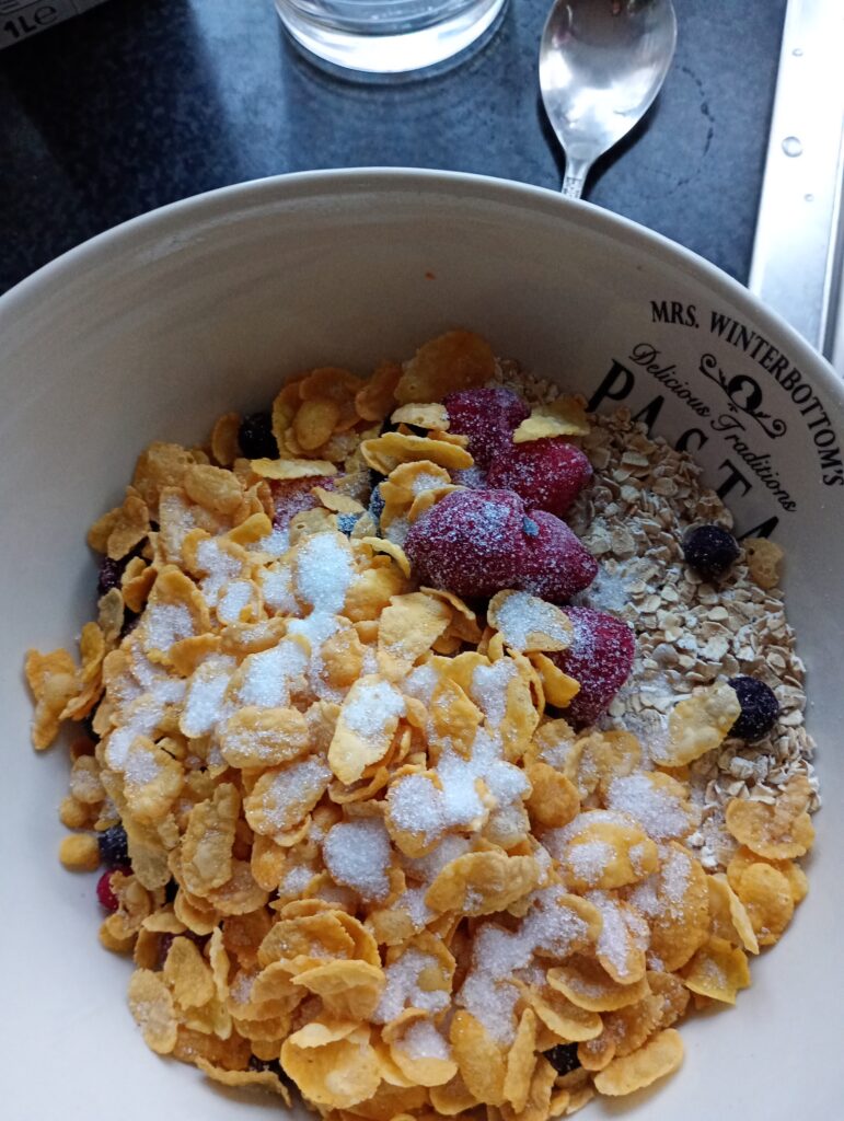 Zutaten: 100-200g Haferflocken, 50g Cornflakes, 50g gefrorere Beeren, 400-500ml warmes Wasser, 20g Zucker
